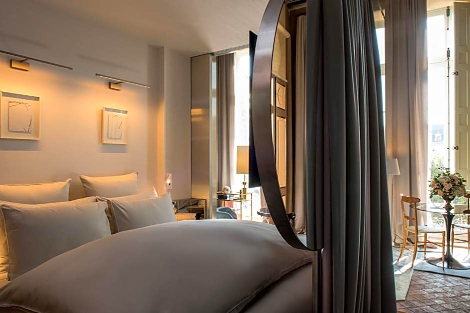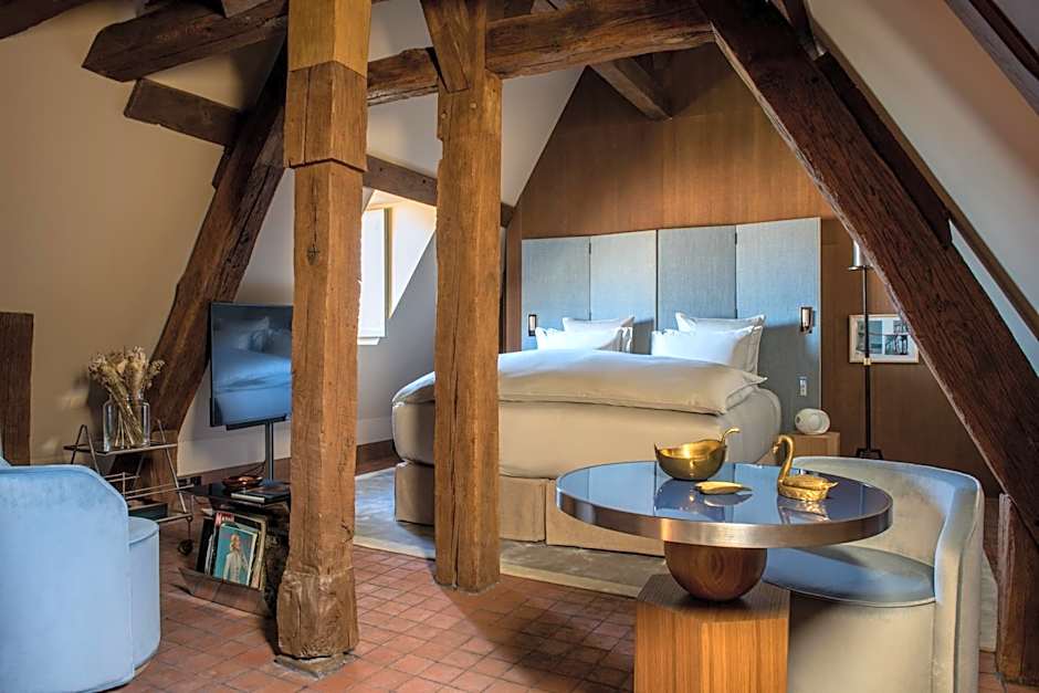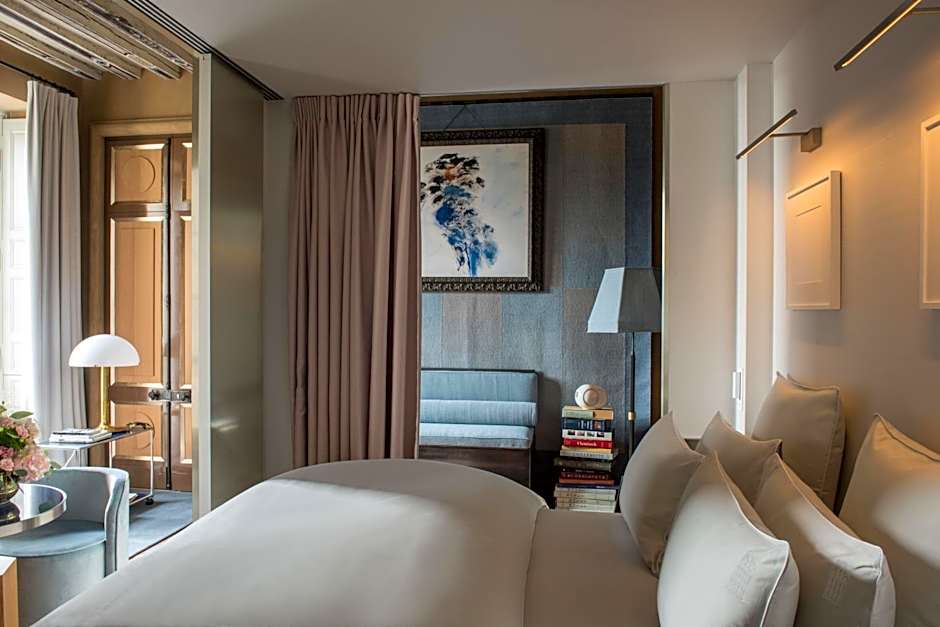 With an amazing view on Place des Vosges and benefiting from 5-yard high ceiling, this Deluxe Suite combines contemporary style with artwork from the 16th century. The king size bed has a steel canopy and the bathroom provides a shower, a bath, Guerlain toiletries and separated toilets. There is a spacious closet and the kitchenette area has an oven, a dishwasher and inductions hobs.